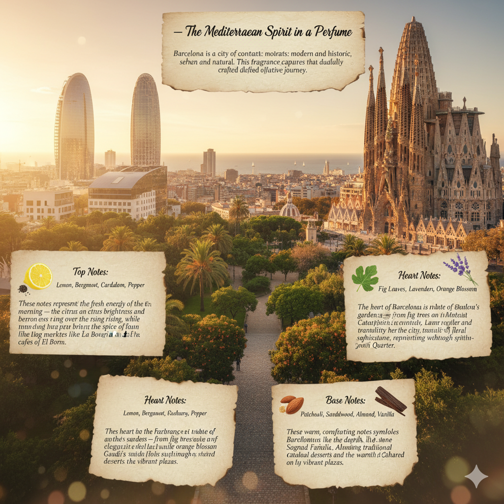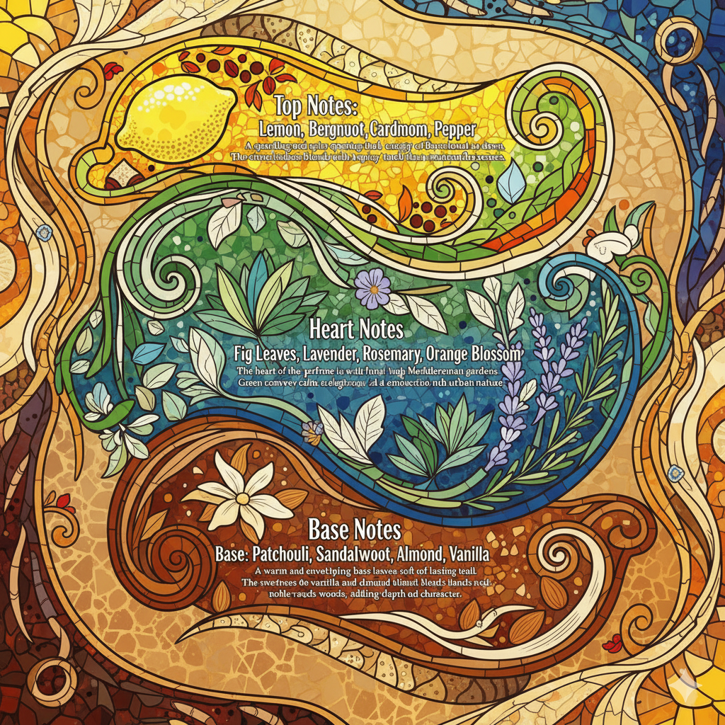 The heart of the fragrance is a tribute to Barcelona’s gardens and green spaces — from the fig trees in Montjuïc to the aromatic herbs of the Catalan countryside. Lavender and rosemary reflect the tranquility and elegance of the city’s architecture, while orange blossom adds a touch of floral sophistication, reminiscent of springtime walks through the Gothic Quarter.